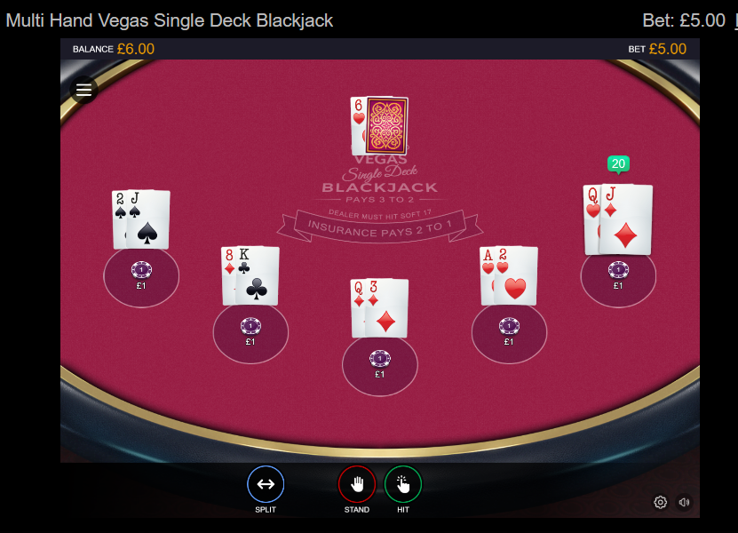 Single deck blackjack offers the player better chances to win as the house take is low even when the deck is shuffled after each hand. Typically the return to player (RTP) on the best single deck game is 99.8% whereas with 6 or 8 decks the RTP is around 99.5%. This difference might not seem that significant, but if you start with a deposit of £100 you might place 1000 bets of £10 each. At the end of that time you would have, on average, £80 remaining at 99.8% but only £50 remaining if the RTP is 99.5% Of course with just a smidgeon of good luck you can come out ahead and most of the welcome offers cover the potential loss. Perfect play, particularly with more than one seat at single-deck, is quite complicated, but, if you follow the chart above you will do well. Wizard of Odds claims that Boss Media have a single-deck game with a payout of 100.15% but I did not find it when I went through all the casinos on this site!