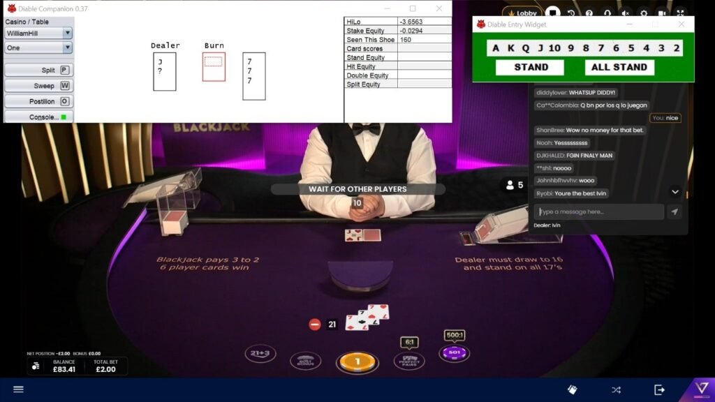 I had placed a £1 bet on the main game and a £1 side bet on Crazy Sevens. The Hilo Count, was -3.65 and the stake equity, the expected value of the main bet, was -2.94%, but I had to have the £1 main bet to have a side bet. The advantage on the side bet was around 10%, not unusual after 180 cards had gone, and it can be seen from the purple chip on the right, that I was paid £501, 500-1, plus my stake return. I could see from the comments that others had placed the bet too, but there were some that did not. Some comments I saw